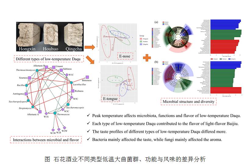 (通讯员 赵慧君)10月14日,食品·化工学院传统发酵食品团队携手石河子大学食品学院、襄阳市酿酒生物技术与应用企校联合创新中心和襄阳市清香型白酒酿造重点实验室在国际知名期刊《Food Research International》(TOP期刊,IF:6.475)上发表了学术论文《Diversity of microbiota, microbial functions, and flavor in different types of low-temperature Daqu》(DOI号:10.1016/j.foodres.2021.110734)。我校与石河子大学联合培养博士研究生蔡文超为论文的第一作者,食品·化工学院郭壮博士为通讯作者,我校为第一单位和唯一通讯单位,研究工作得到了williamhill英国教师科研能力培育基金科技创新团队(2020kypytd009)和襄阳市重大科技计划项目(2020AAS002141)资助,研究工作以我校食品配料湖北省工程技术研究中心为依托开展。