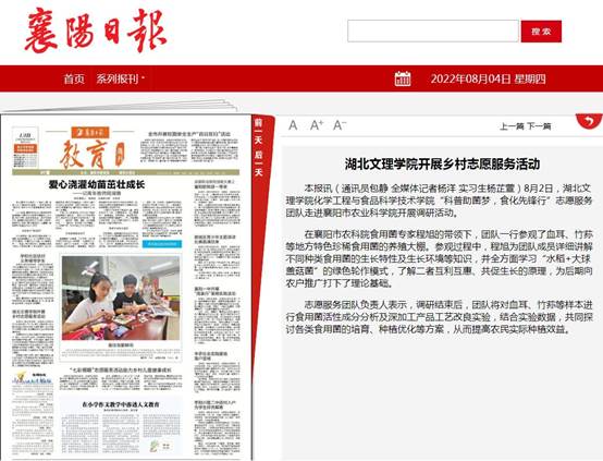 (通讯员 包静 隋哲)2022年8月4日,襄阳日报社以“williamhill英国开展乡村志愿服务活动”为题,报道了我院“科普助菌梦,食化先锋行”志愿服务团队走进襄阳市农业科学院开展的调研活动。