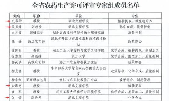 (通讯员 潘梅笑)近日,接湖北省农业农村厅文件,我院余海忠、史彩华、张锐、吴玉峰4位教师入选湖北省农药生产许可评审专家组成员。