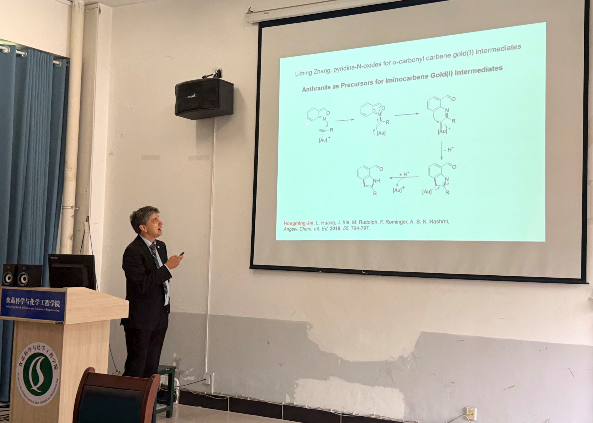 报告会上,Hashmi院士首先以“金催化:概念与应用”为题,带来了一场高屋建瓴的分享。他从大众对金“惰性”的普遍认知切入,系统阐述了金作为过渡金属催化剂在有机合成中展现出的独特活性与迷人魅力。Hashmi院士不仅梳理了金催化的发展脉络,还通过丰富实例展示了金催化剂在高效构建复杂分子结构方面的强大能力,增进了师生对金催化研究价值的深刻理解。