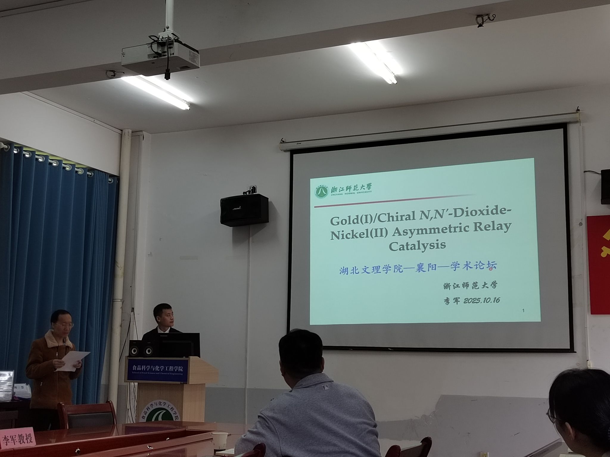 随后,李军教授以“一价金与二价手性镍接力催化实现不对称合成”作专题报告。李教授聚焦于均相金催化在手性控制上面临的挑战,创新性地提出了“金/镍接力催化”这一巧妙策略,详细讲解了如何利用双金属催化体系完成对反应活化和手性控制的互补作用。