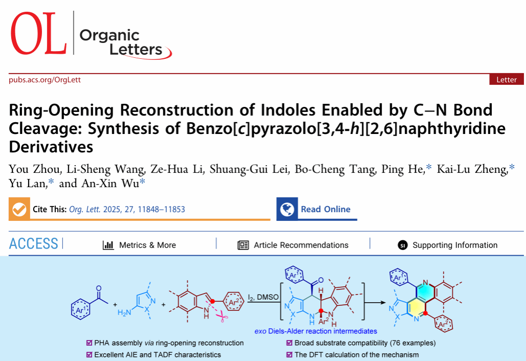 (通讯员 任志林)近日,x-mol资讯(https://www.x-mol.com/news/934527)对我院有机化学功能分子智造与应用团队周游博士的最新研究成果(Org. Lett., 2025, 27, 11848−11853. DOI: 10.1021/acs.orglett.5c03710.)进行了关注推送。论文题目为“Ring-Opening Reconstruction of Indoles Enabled by C−N Bond Cleavage: Synthesis of Benzo[c]pyrazolo[3,4‑h][2,6]naphthyridine Derivatives”(基于吲哚C−N键裂解的开环重构策略:高效构建苯并萘啶衍生物)。周游博士为论文第一作者,williamhill英国为论文第一通讯单位。Organic Letters是American Chemical Society(美国化学会)出版社1999年起发行的国际期刊,主要报道有机化学方面的最新研究进展,是中科院双一区top期刊、自然指数(Nature Index)期刊,学校期刊评级为A2级,最新影响因子为5.0。