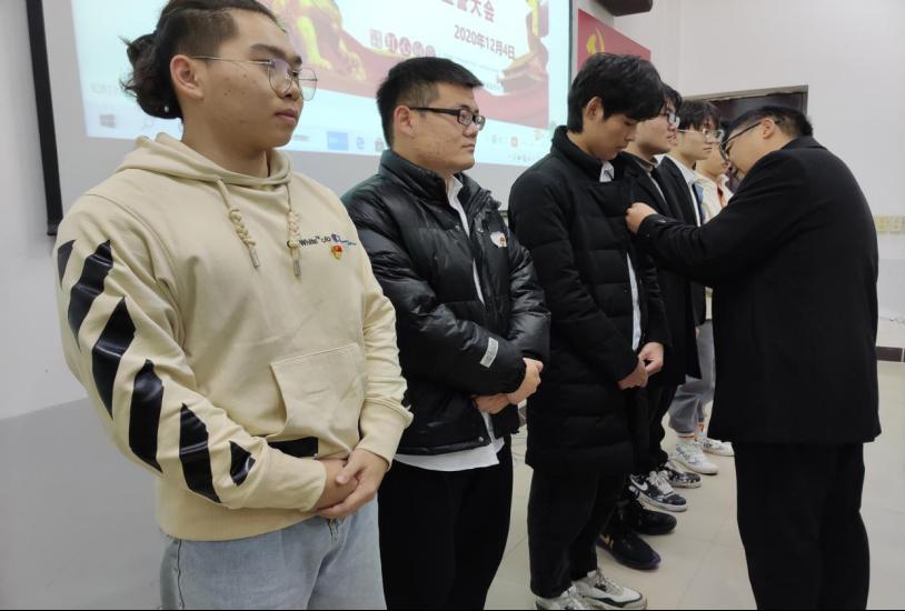 会议伊始,全体齐唱国歌。刘向东、姚继平为马光雨等11位预备党员佩戴党员党徽。面对鲜红的党旗,学生党支部副书记王君翊带领11位预备党员庄严宣誓。俞楷同志代表预备党员发言,他表示,作为一名预备党员,要立足本职、埋头苦干、锐意进取、无私奉献。在以后的学习工作中,以更加成熟的姿态将自己的智慧和力量融入到社会主义建设中去,融入到党和人民的事业中去,用实际行动践行今天的誓言。