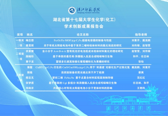 (通讯员 刘素芹)由湖北省化学化工学会主办、汉江师范学院承办的湖北省第十七届大学生化学(化工)学术创新成果报告会于2024年6月1日至6月2日在汉江师范学院举行。我校食化学院组织10位学生参赛,经过激烈角逐,获得一等奖2项、二等奖3项、三等奖5项。
