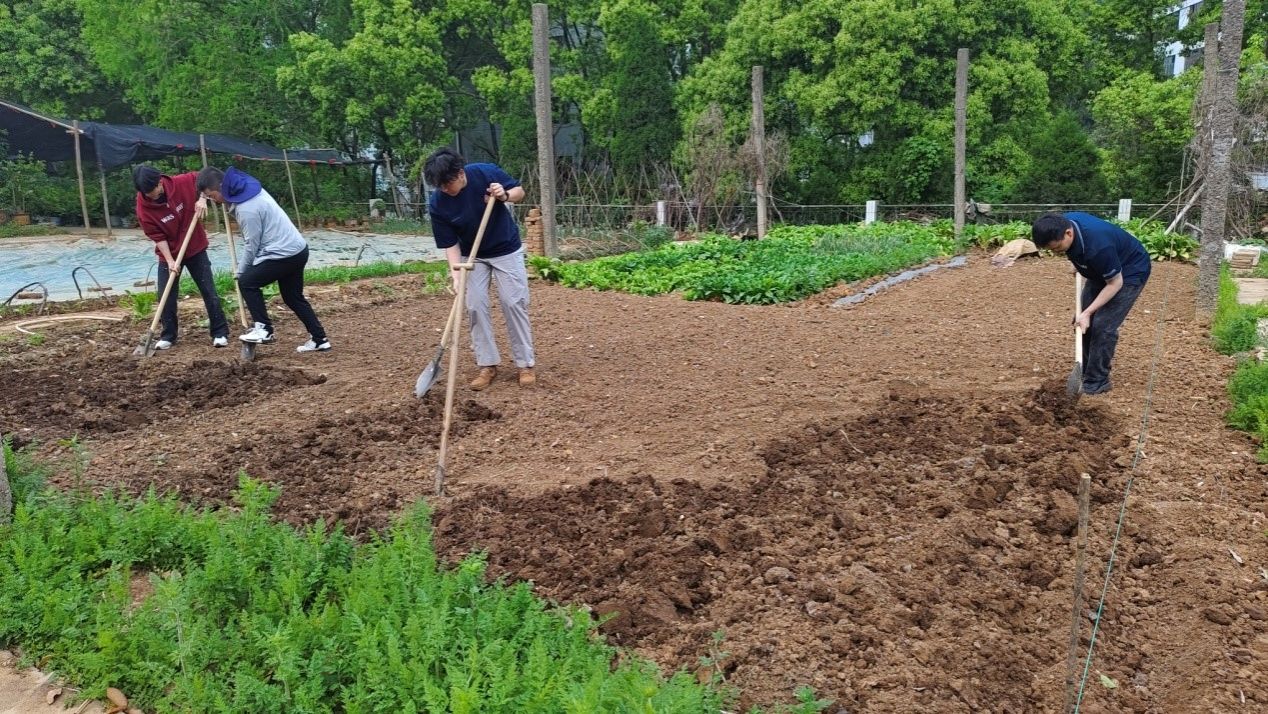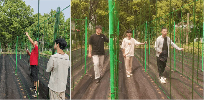 团队成员分工明确,挖地、开沟、起垄、铺网、搭架,现场秩序井然,气氛热烈。研究生李振嘉作为团队的一员,积极参与了此次活动,他感慨道:“田间活动太有意义了,既能将书本和实验室学到的理论知识与生产实践相结合,又能让我们近距离感受大自然的景色,体验劳动的乐趣。”