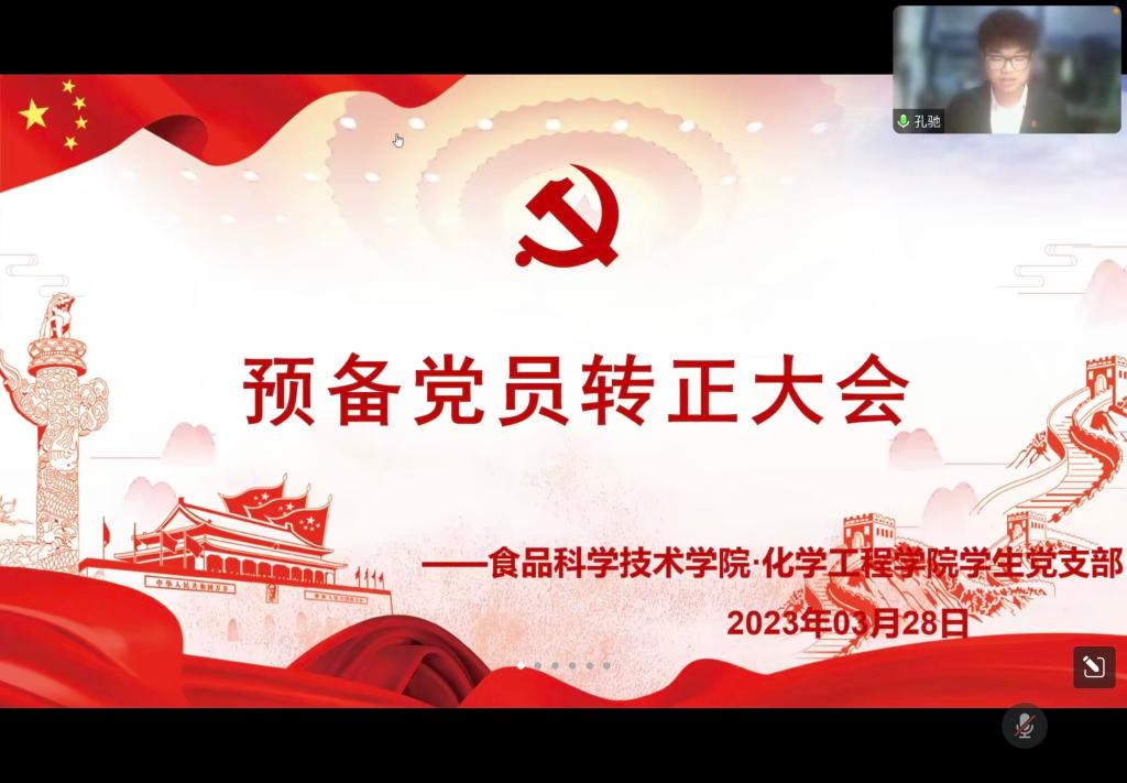 (食品·化工学院 通讯员 唐樱)3月28日晚上6:30,食品·化工学院学生党支部通过腾讯会议召开预备党员转正大会,学院党委副书记刘向东及全体学生党员、预备党员参加会议。