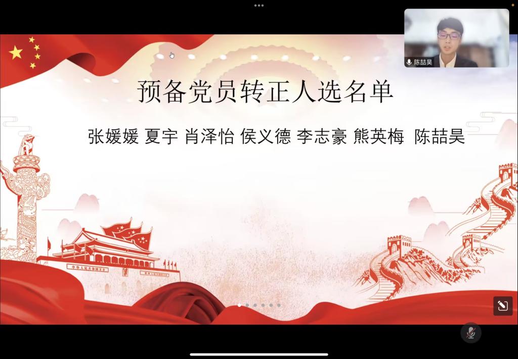(食品·化工学院通讯员季也)6月10日上午11:00,食品·化工学院学生党支部于腾讯会议线上召开预备党员转正大会,食品·化工学院党委副书记刘向东、学生党支部书记包静以及全体学生党员、预备党员参加会议。