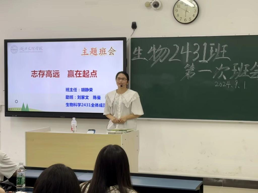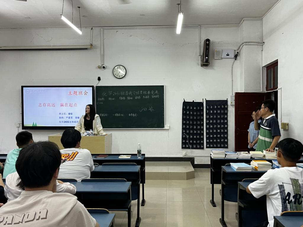 生物科学2431班班主任胡静荣、化学2431班班主任潘聪向同学介绍学校概状、专业介绍,同时对新同学开展防诈骗防溺水等安全教育。随后学生依次进行自我介绍,上台发表班委竞选宣言。